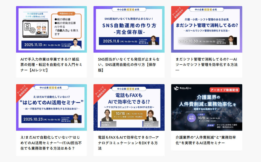 また、ホリエモンAI学校では定期的に無料のセミナーを開催しています。アーカイブで後からでも見ることができます。