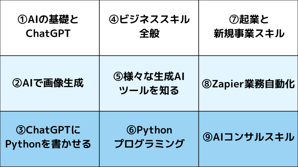 AIの基礎知識、プロンプト設計、ChatGPTの活用法までを段階的に習得できます。毎週宿題を提出するので継続的に頑張れそうですね!