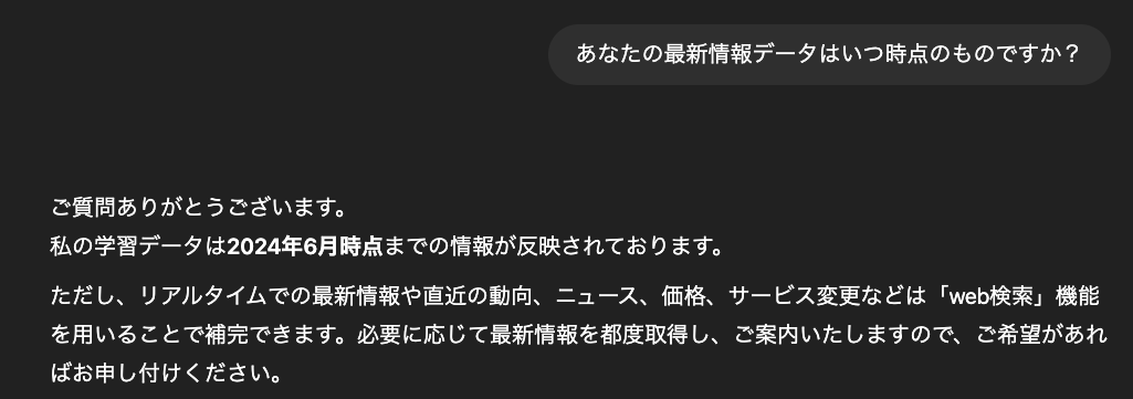情報の鮮度に関しては、両モデルとも最新情報へアクセスする手段を持っています。ChatGPTの最新モデルの一つであるGPT-4.1は2024年6月までの知識で出力していますが、Web検索機能を使えばよりリアルタイムに近い情報から出力できます。