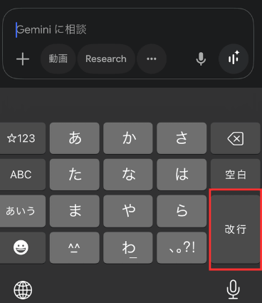 スマホのGeminiアプリでは、キーボードに表示されている「改行」キーをタップするだけで簡単に改行できます。