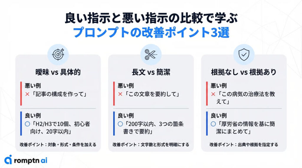 ChatGPTを効果的に使うには「どんな指示を与えるか」が結果を大きく左右します。ここでは、悪い例と良い例を比較しながら、ChatGPTの使い方のコツを具体的に解説します。