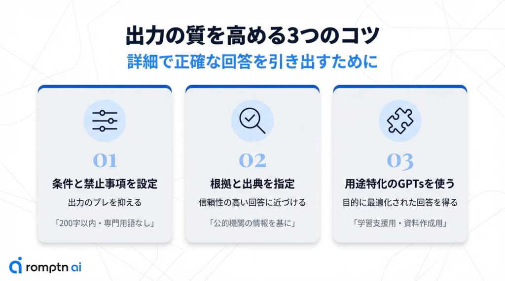 - 出力の質を高めるには「前提や目的」「条件や禁止事項」「根拠確認」の3つが重要