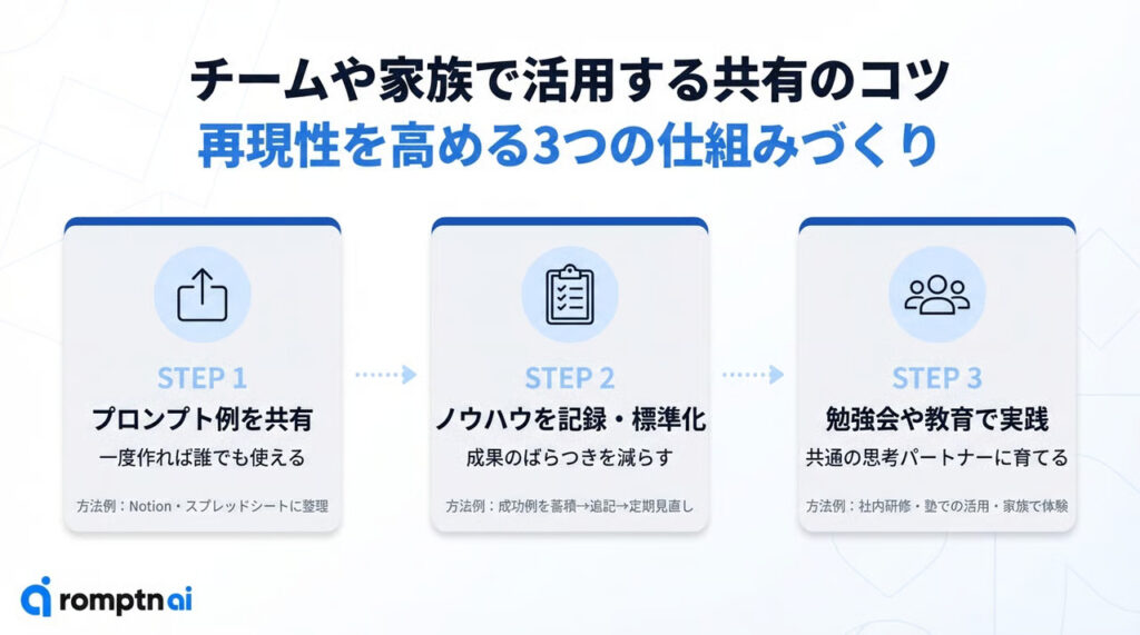 - チームや家族でプロンプトやノウハウを共有すると、誰でも同じように成果を再現できる