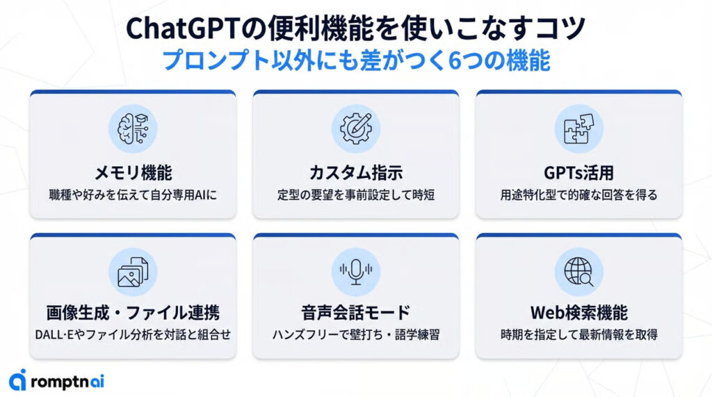 ChatGPTの実力を引き出すには、プロンプトの工夫だけでは不十分です。実はChatGPTには回答の質や効率を大幅に高める便利機能が多数搭載されています。ここでは、知っているだけで”使いこなし度”が一気に上がる6つの機能と、その活用のコツを紹介します。