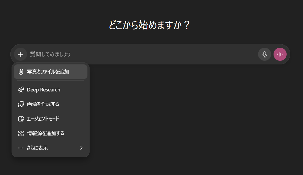 以下のように、+マークから、「写真とファイルを追加」を選択してください。