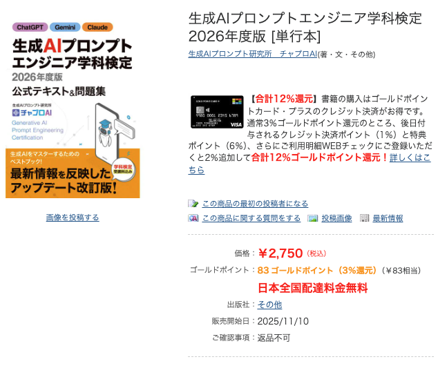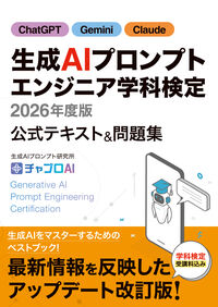 2026年度版の公式テキスト『生成AIプロンプトエンジニア学科検定 2026年度版』は2,750円で販売されており、公式テキスト内に記載されている専用コードを入力することで学科試験が受験できます。