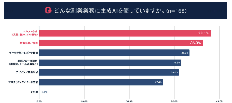 具体的な活用業務としては、テキスト作成(資料、記事、SNS投稿)が38.1%と最も多く、次いで情報収集・調査が36.3%となっています。特に文章作成は多くの副業に共通する基本業務であり、AIの汎用性の高さが発揮されている分野と言えるでしょう。