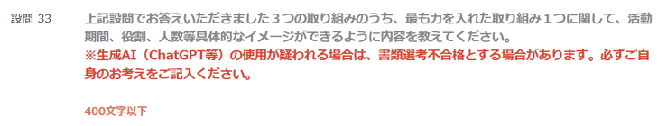 実際、以下のように「生成AIの使用が疑われるESは書類選考不合格」と明言する企業も出始めています。