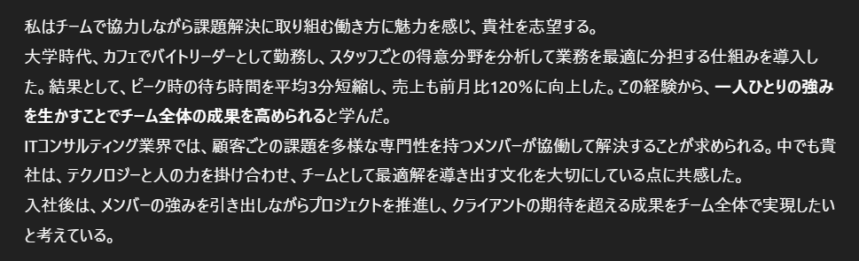 「就活生が自分の言葉で書いたように、柔らかく自然な文体にしてください。 文章のリズムや語尾を少し変えて、AIっぽくならないように。」