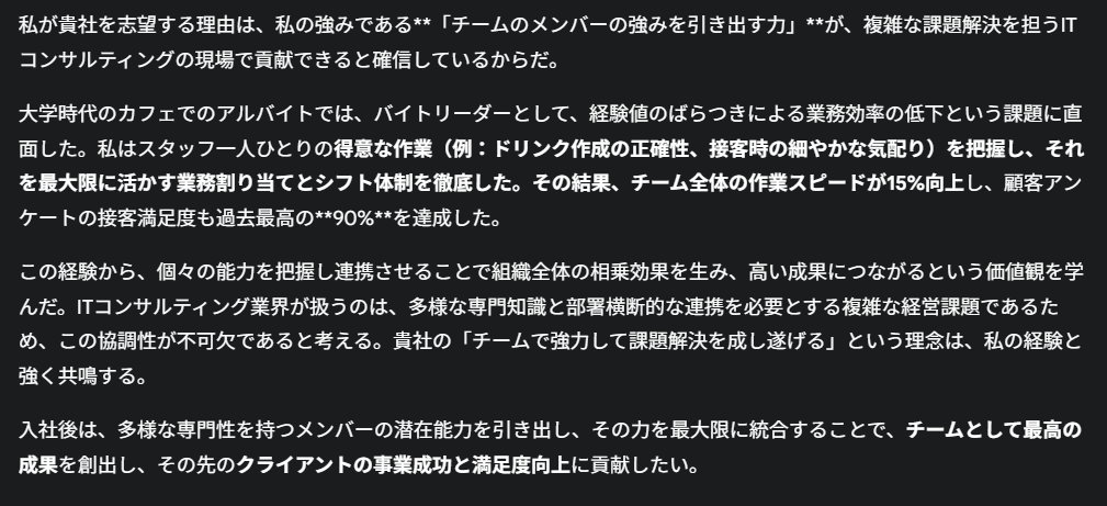 どちらも得意分野が違いますが、総合的に見るとGeminiがより優れた志望動機を生成しました。