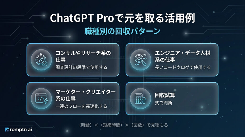 月3万円前後のChatGPT Proでも、時間短縮だけで回収できる計算になります。
