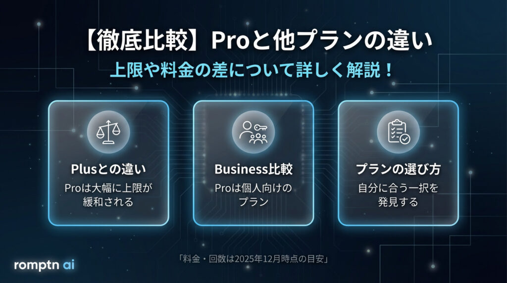 この章では、ChatGPT ProとPlus・Businessの違いを「上限(回数)」「使える機能」「運用単位(個人/チーム)」の3軸で比較します。