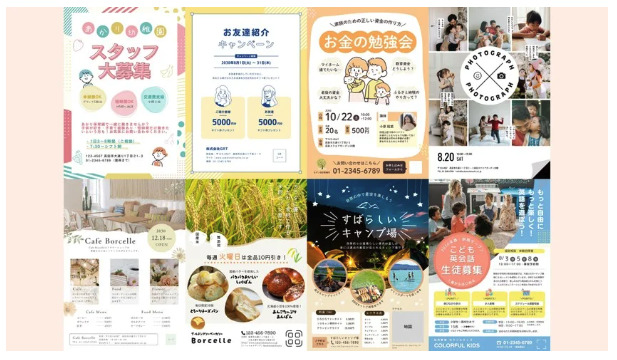 小規模事業者や個人サロンで活用されやすく、Canvaで編集OKなファイルが重宝されます。名刺やチラシは印刷して実際に使用するため、完成形がイメージしやすく、クライアントにも喜ばれやすい案件です。