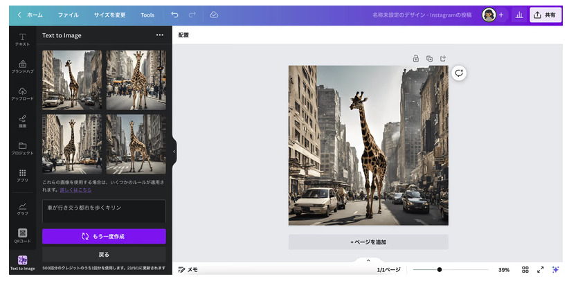 テキストで指示を入力するだけで、オリジナルの画像やイラストを自動生成できる機能です。素材サイトで見つからない独自のビジュアルを作れるため、テンプレート販売やグッズデザインで他と差別化したい場合に重宝します。