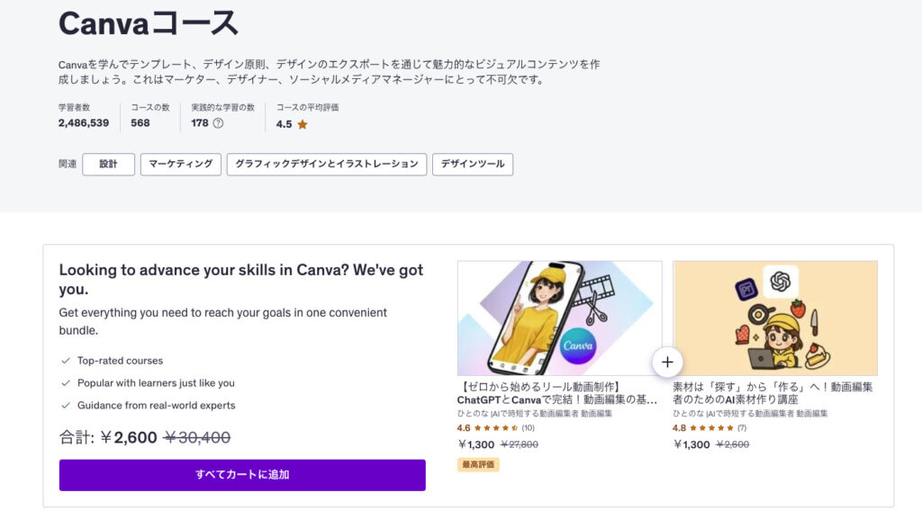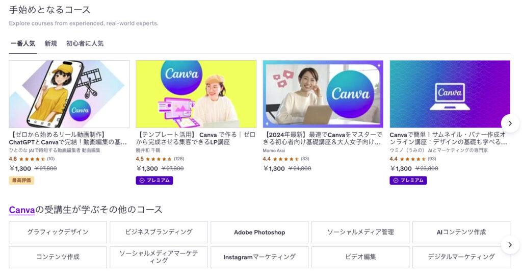 ストアカやUdemy、ココナラなどのプラットフォームを活用して、Canvaの使い方を教える方法です。場所を選ばず、全国どこからでも受講生を集められるのが大きなメリットです。実際に、Udemyでは以下のような講座が提供されています。