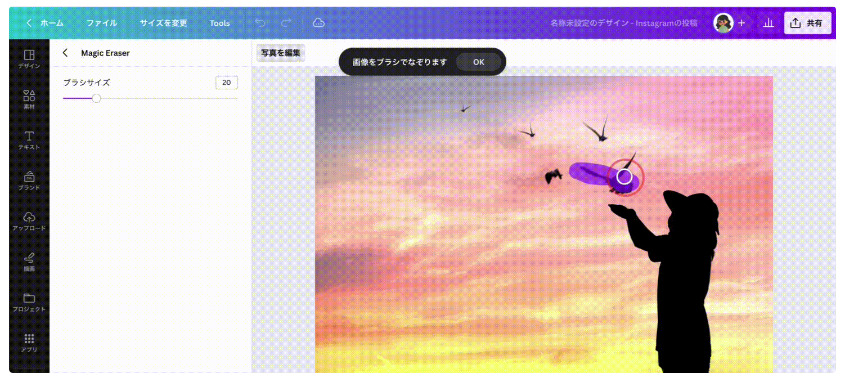 写真に写り込んだ不要なものをワンクリックで消去できる機能です。クライアントから提供された素材の修正や、商品画像の背景整理など、細かな画像編集が必要な受注案件で役立ちます。