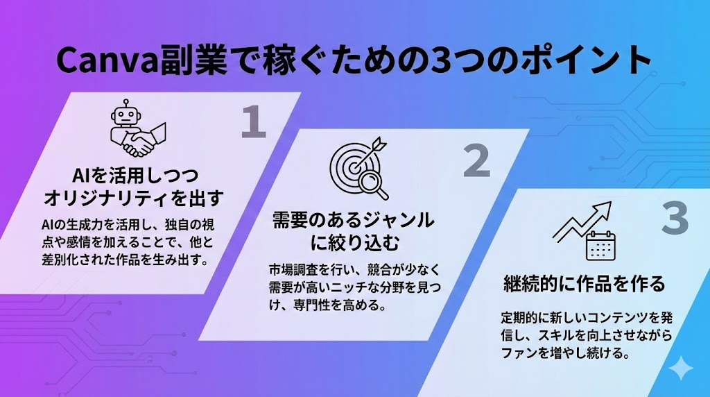 Canva副業を始めても、なかなか収益が上がらず挫折してしまう人も少なくありません。しっかり稼ぐためには、いくつかの重要なポイントを押さえておく必要があります。ここでは、初心者が収益化するために意識すべき3つのポイントを解説します。