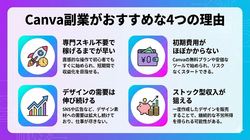 ここではCanvaを使った副業がおすすめである理由を4つご紹介します。