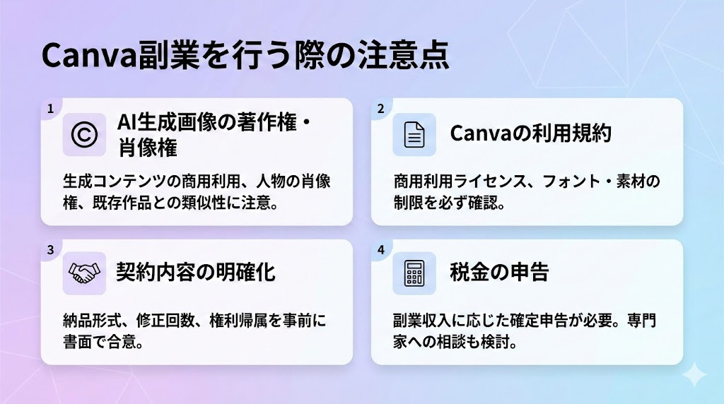 Canva副業で安定して稼ぎ続けるためには、いくつかの重要な注意点を理解しておく必要があります。知らずに違反してしまうと、せっかく作った作品が販売停止になったり、クライアントとトラブルになったりする可能性があります。ここでは、特に気をつけるべき4つのポイントを解説します。