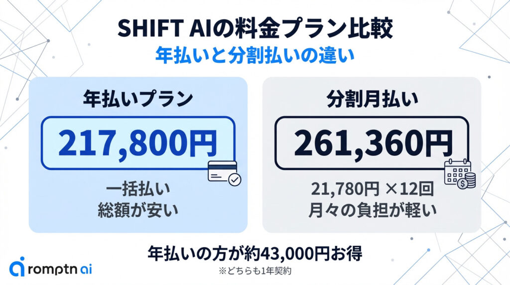 - SHIFT AIの料金は月払い21,780円と一括217,800円の明確な2プラン体制