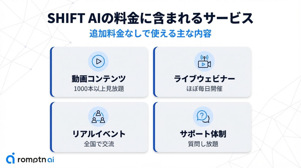 SHIFT AIの料金には、AI学習に必要なあらゆる要素が包括的に含まれています。ただの動画視聴だけでなく、実践的な学習からコミュニティ交流まで、幅広いサービスを追加料金なしで利用できる点が大きな魅力です。
