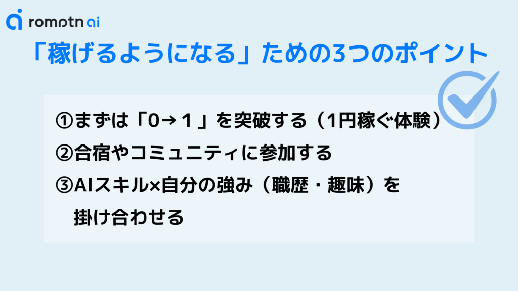 重要なのは「AIツールを使いこなすスキル」と「それを収益化する行動力」の両方を身につけることなんですね。