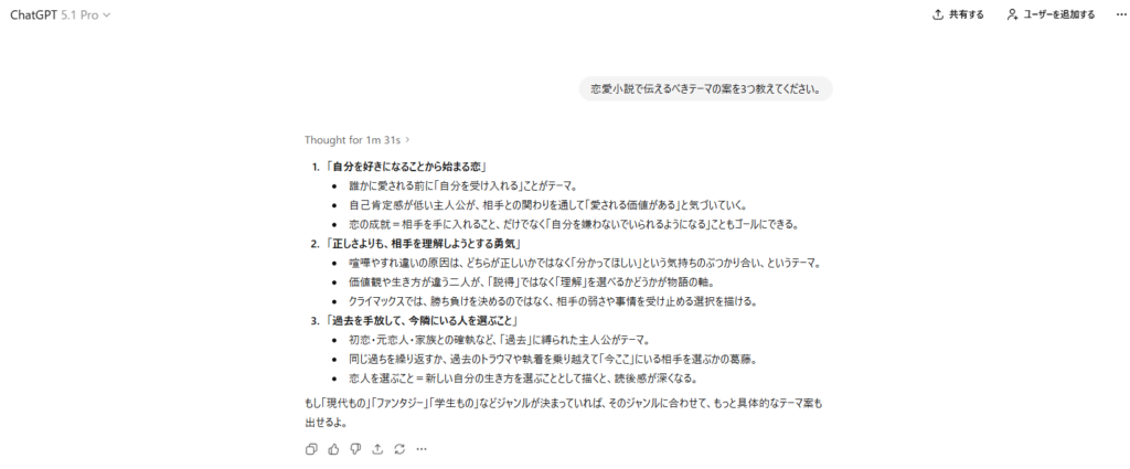 小説は、テーマの精巧さが鍵を握るといっても過言ではありません。ChatGPTに小説を生成させる前にしっかりと考えておくと、より理想の小説に近づきます。