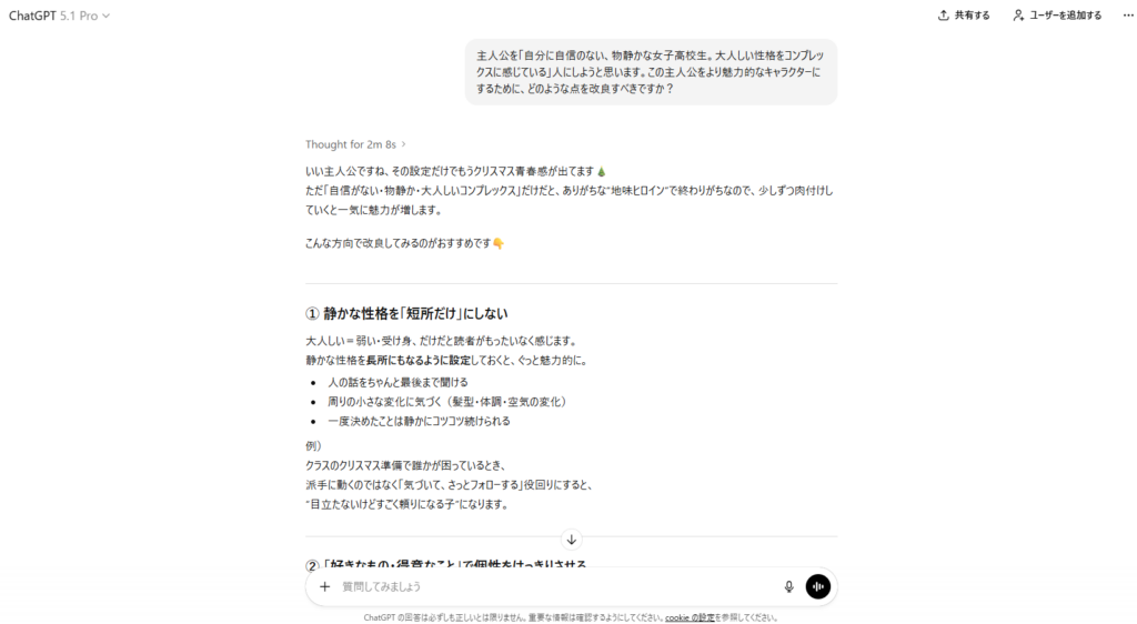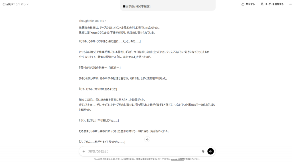 さらに、ChatGPTは客観的で一貫性のある文章を書くことにも優れています。適切なプロンプトを入力すれば、途中で設定がブレることのない、筋道の通った小説を作ることができます。