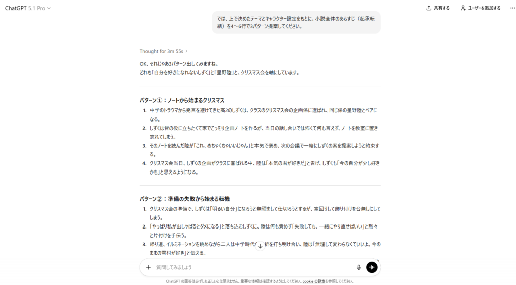「上で決めたテーマとキャラクター設定をもとに、小説全体のあらすじ(起承転結)を4〜6行で3パターン提案してください。」
