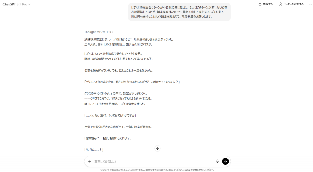 そこで、「2人はこのシーン以前、互いの存在は認識していたが、話す機会はなかった。勇気を出して進行するしずくに、陸は興味を持った」という設定を追加して、再度執筆するよう指示を出します。