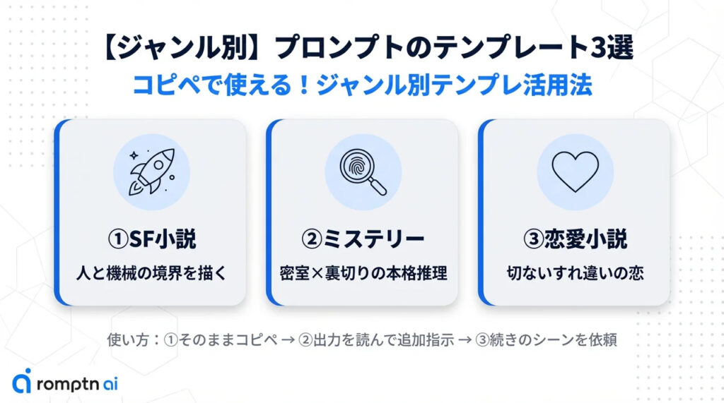 実際に小説の生成に使えるテンプレートを、ジャンル別に3つ紹介します。