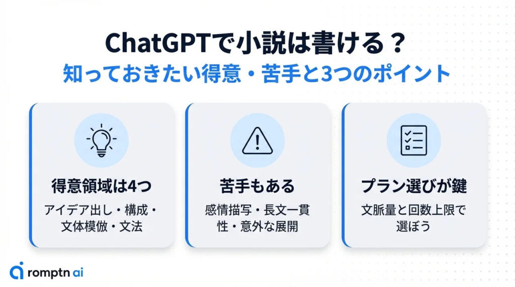 ChatGPTには得意な領域と苦手な領域がはっきりあり、それを理解したうえで使い分けることが、AI小説のクオリティを左右します。まずは、ChatGPTの「できること」と「できないこと」を押さえておきましょう。