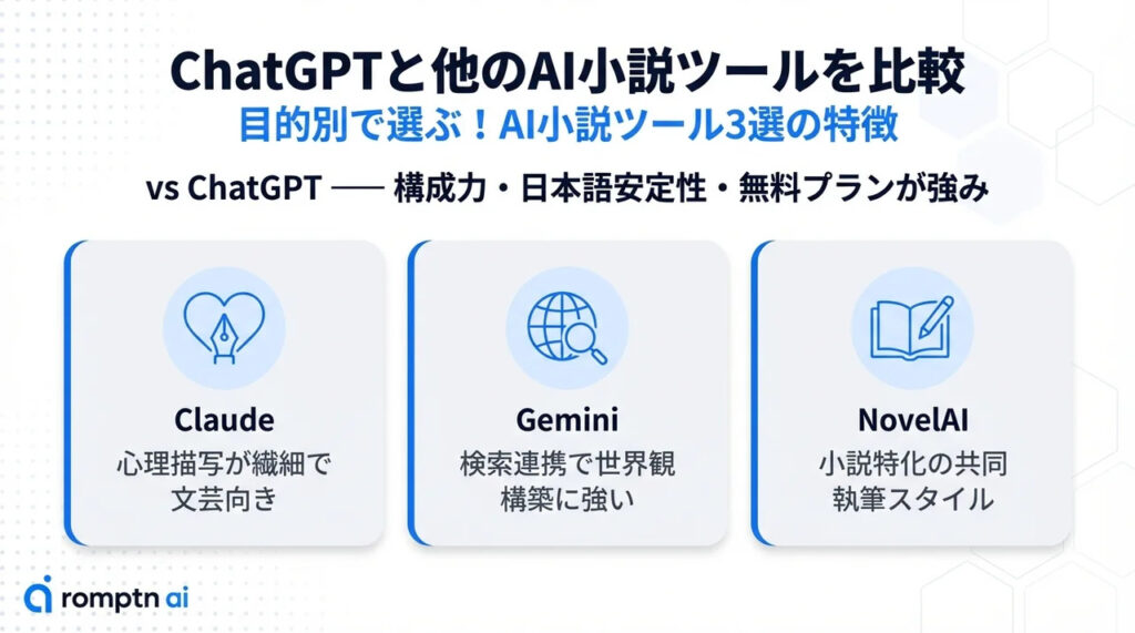 ChatGPT以外にも、小説執筆に活用できるAIツールは複数存在します。それぞれ得意分野が異なるため、目的やジャンルに応じて使い分けたり、併用したりするのも有効な戦略です。