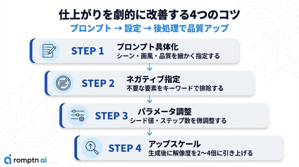 AI画像合成ツールは、使い方次第で仕上がりの品質が大きく変わります。ここでは、生成結果のクオリティを一段階引き上げるための実践的なコツを紹介します。