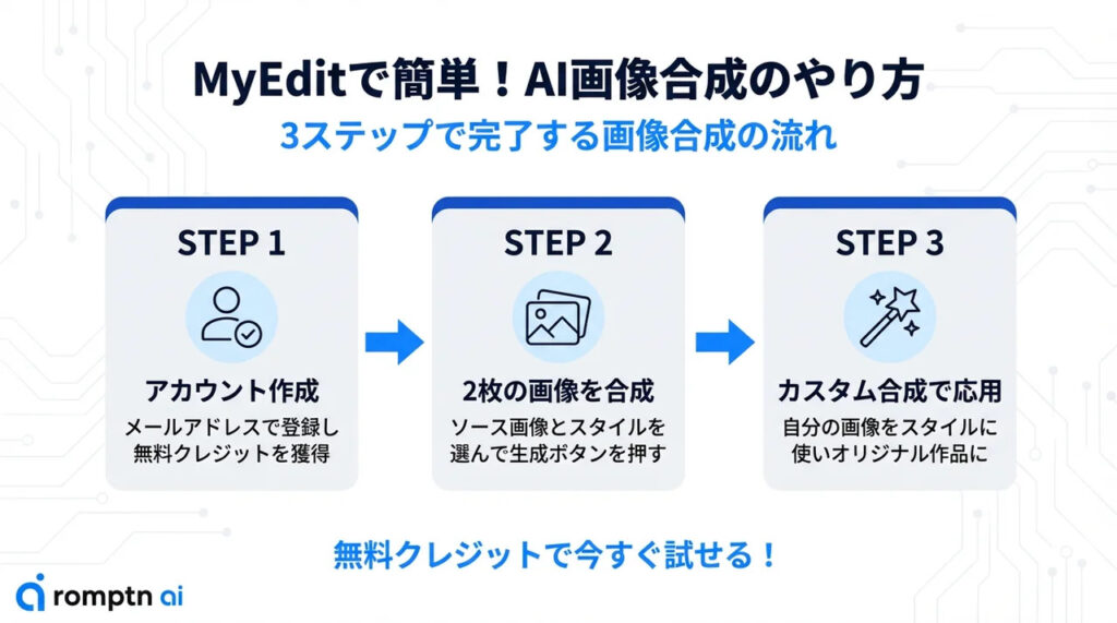 画像合成ツールの使い方はとても簡単です。代表としてMyEditを使用して、AI画像合成にチャレンジしてみましょう!