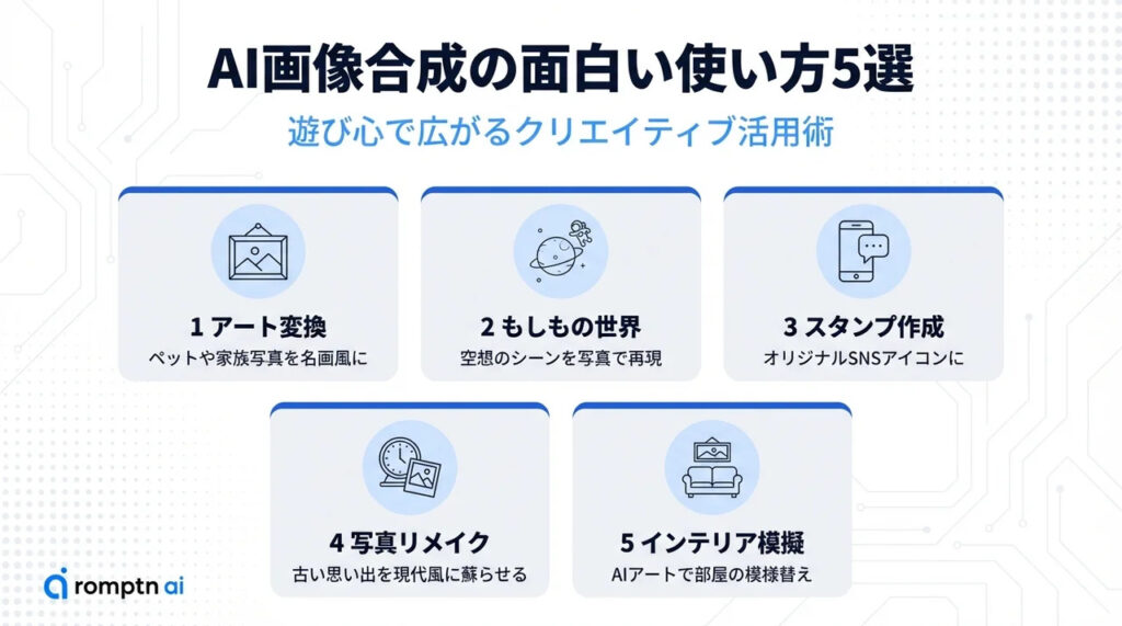 AI画像合成ツールは、仕事や実用的な目的だけでなく、遊び心のあるクリエイティブな使い方でも大いに楽しめます。ここでは、思わず試してみたくなるユニークな活用アイデアをご紹介します。