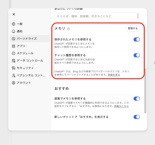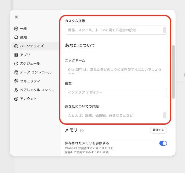 調教においてメモリ機能が重要なのは、”使い込むほど自分に最適化されていく“という体験を生み出すからです。カスタム指示だけでは表現しきれない細かな好みや文脈——たとえば進行中のプロジェクトの内容、よく使うフレーズ、過去にダメ出しした回答パターンなど——を、ChatGPTが少しずつ学習してくれます。
