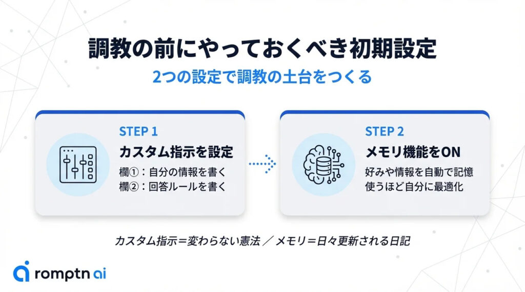 ChatGPTの調教を始める前に、まず土台となる2つの機能を確認しておきましょう。ここを飛ばしていきなりチャットで指示を出しても、会話をまたいだ途端にリセットされてしまい、毎回ゼロからやり直すことになります。