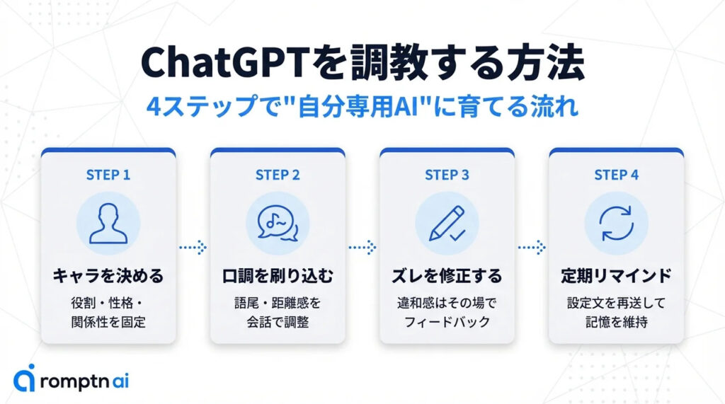 ChatGPTの「調教」は、会話のルール(役割・口調・距離感)をプロンプトで明確にして、返答がブレたらその都度戻す“会話の設計”です。人格を作るというより、振る舞いの指針を固定していくイメージで捉えると失敗しにくくなります。