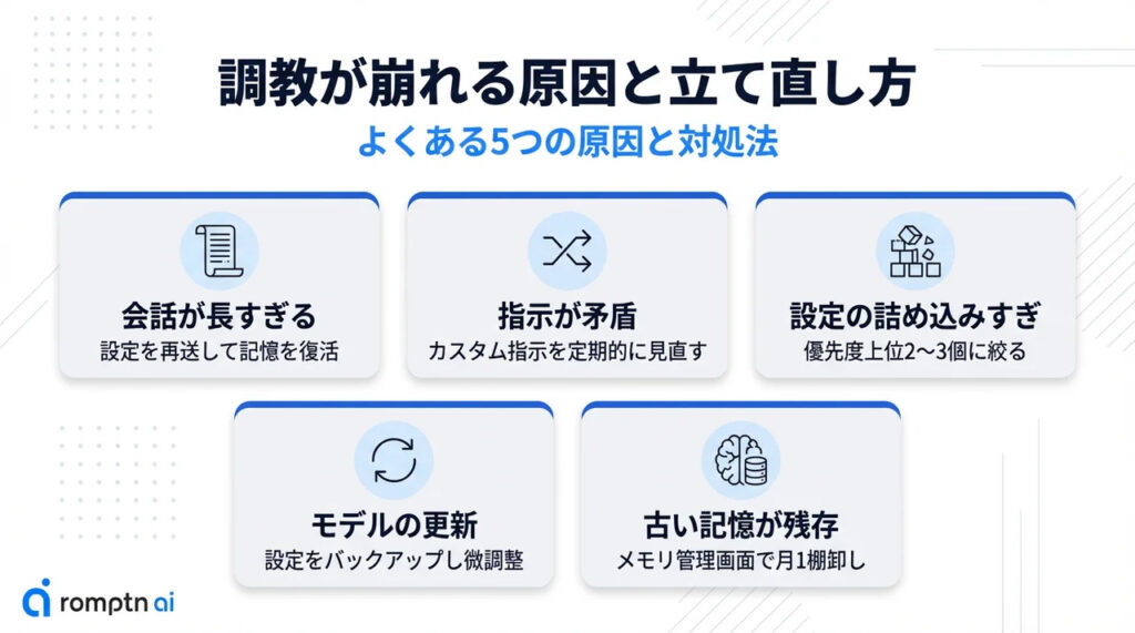せっかく時間をかけて調教したChatGPTが、ある日突然”別人”のような回答を返してくることがあります。これは珍しいことではなく、多くのユーザーが経験する現象です。崩れる原因にはパターンがあるので、それぞれの対処法を知っておけば慌てずに済みます。