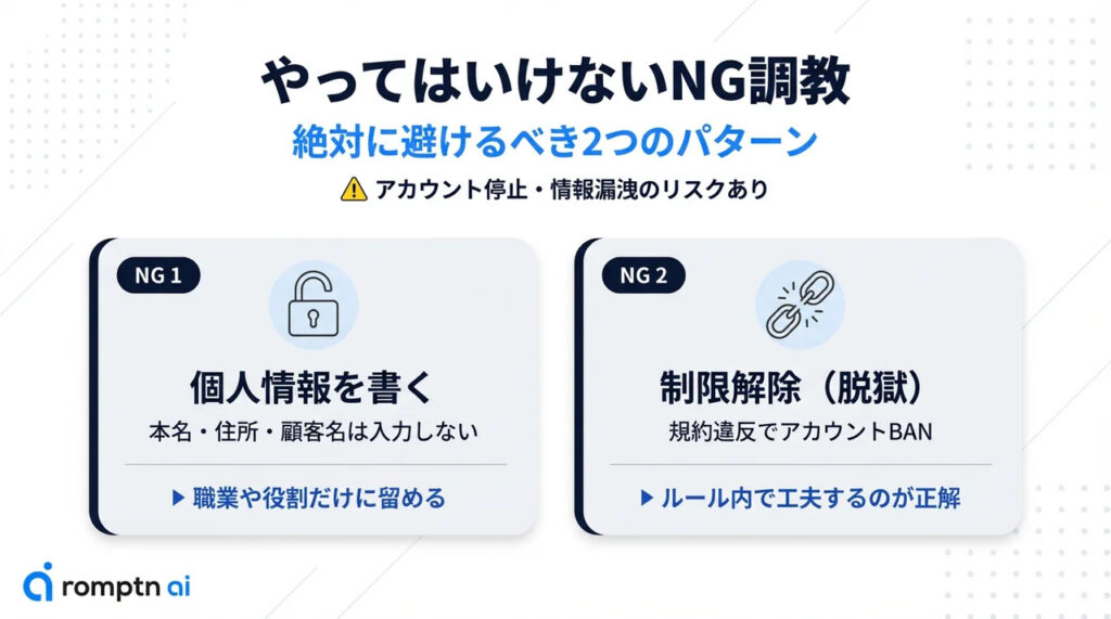 調教はChatGPTを自分好みに育てる楽しい作業ですが、何でも自由にやっていいわけではありません。やり方を間違えると、個人情報の流出やアカウント停止といった深刻なリスクにつながる可能性があります。ここでは、絶対に避けるべき2つのNGパターンを紹介します。