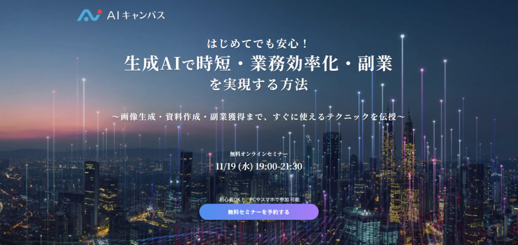 AIキャンパスの無料オンラインセミナーは、「なぜ今、生成AIを学ぶ必要があるのか?」という背景から、具体的な活用ツール、そしてそれを副業・起業といった収益化につなげるまでのロードマップを学べます。