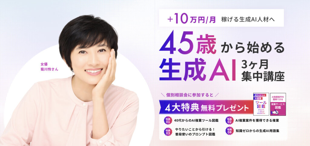 最短1ヶ月でChatGPT、画像・動画生成AIなど、収入に直結するAIスキルの習得を目指したい方は、まずこの無料相談セッションで疑問を解消しましょう。特典として、サブスク料金6ヶ月間無料など、豪華キャンペーンの適用チャンスもあります。