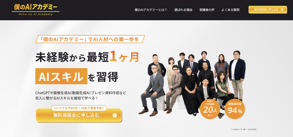 | ⑥ 僕のAIアカデミー無料相談会 | 約1h / 毎日 | Google Meet / サブスク6ヶ月無料+資料10本 | 未経験から最短1ヶ月で収益化を目指すためのAIスキル相談 |
