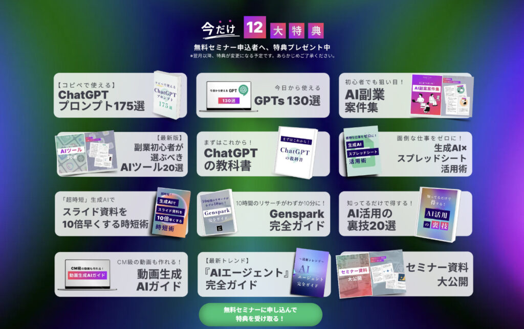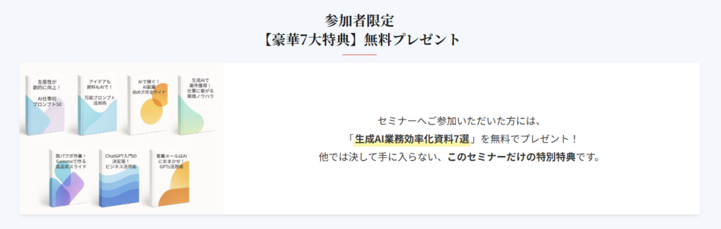 このセミナーに参加すると、以下のような「AI副業始め方完全ガイド」や「生成AIで案件獲得!仕事に繋がる実践ノウハウ」など豪華7大特典が無料でプレゼントされます。