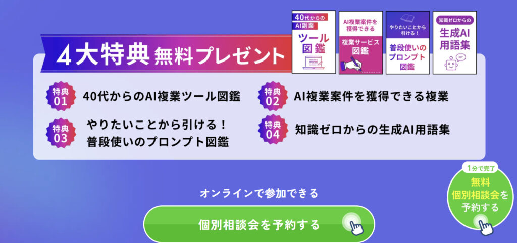 個別相談の形式で、年齢やこれまでの経験を踏まえた上で、AIを活用した副業の可能性についてアドバイスを受けられます。また、ライフシフトラボでは以下のような4大特典が受け取れます!