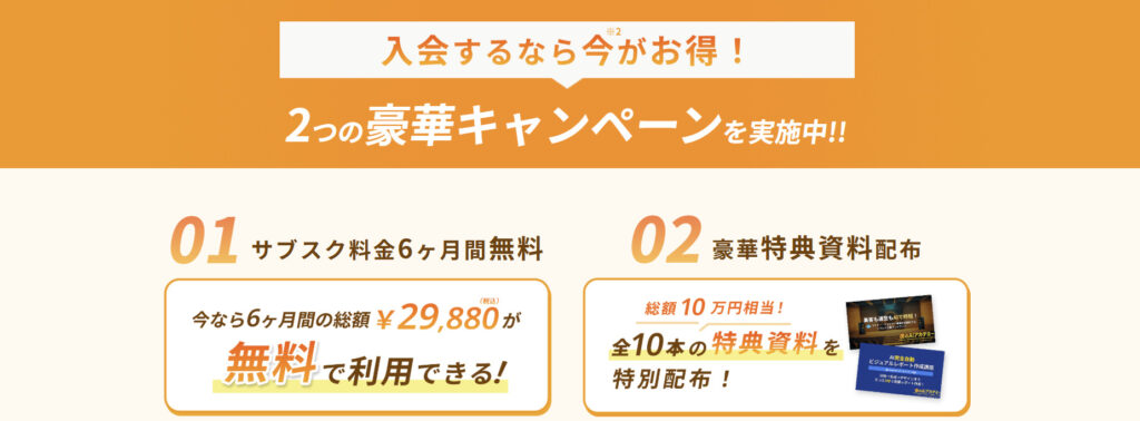 | 特典 | サブスク料金6ヶ月間無料/10本の豪華特典資料 |