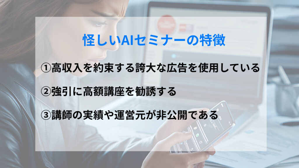 そこでここからは、信頼できる講座を選べるよう悪質なAI副業セミナーに共通する3つの具体的な特徴を紹介します。