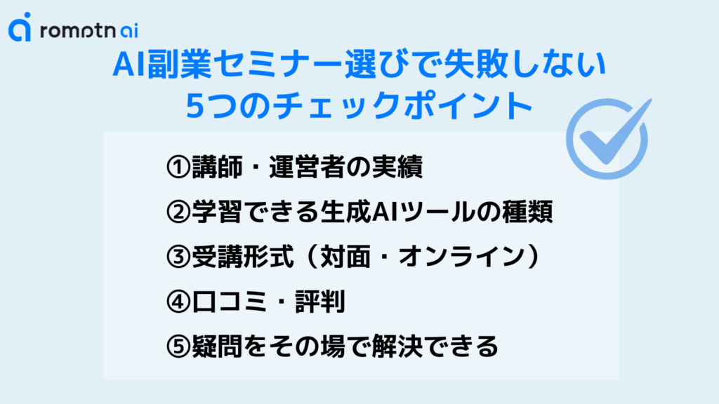 AI副業セミナーを選ぶ際は、以下5つのポイントを必ずチェックしましょう。 これらを確認することで、自分に合った信頼できるセミナーを見つけることができます。