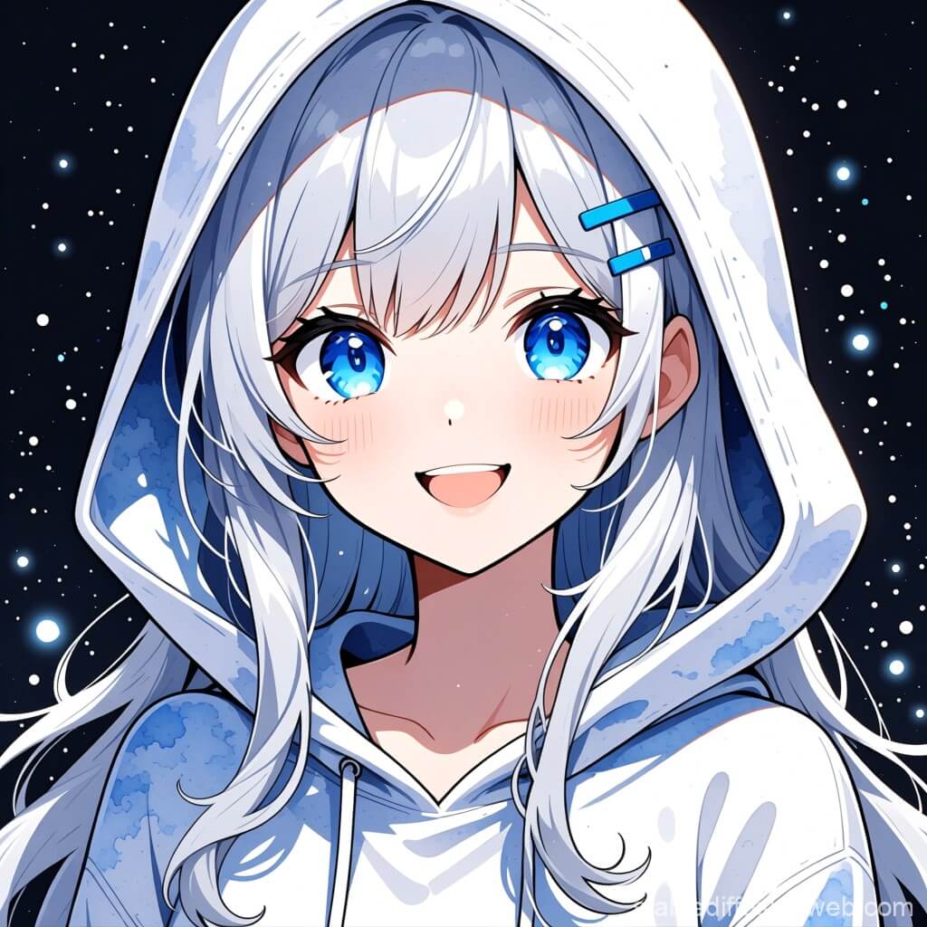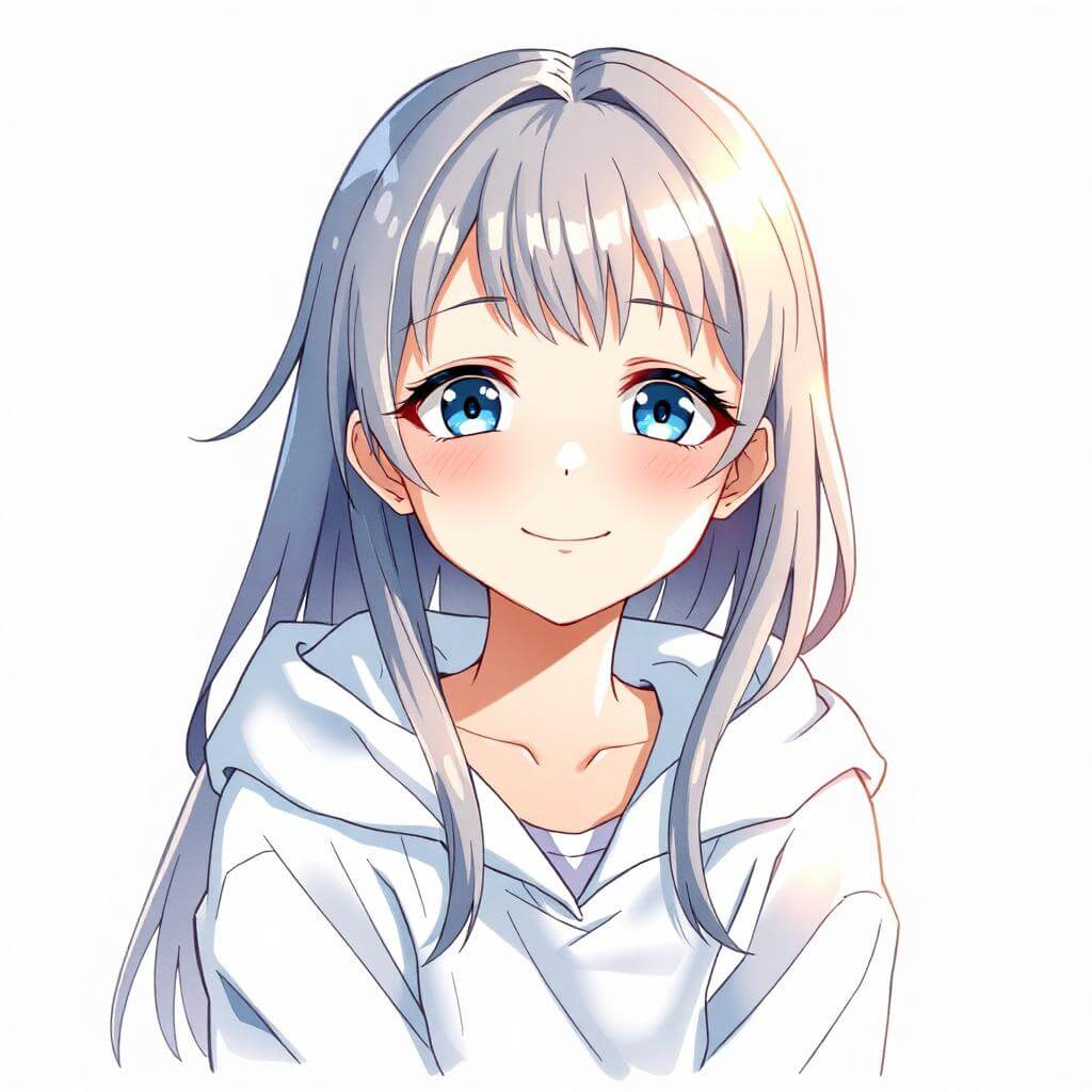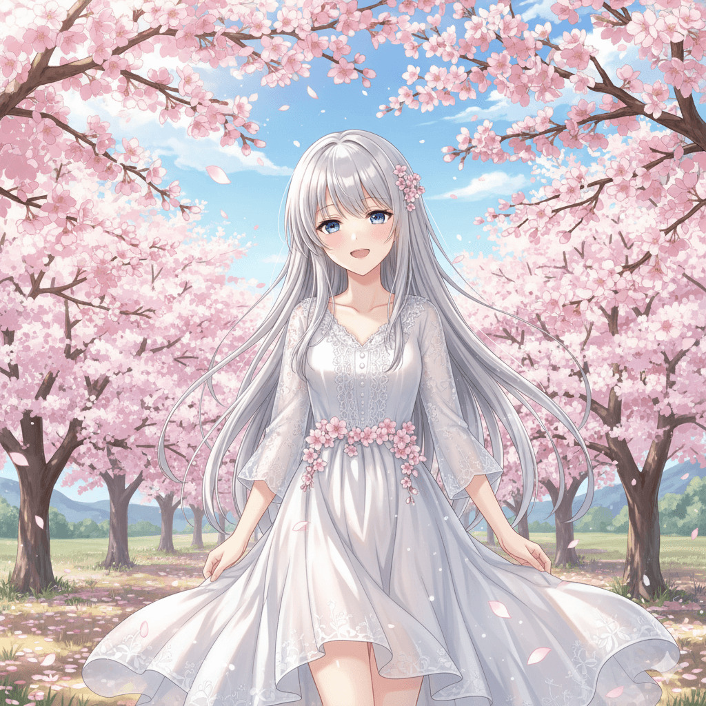 (1人の女の子、長い銀髪、青い瞳、白いワンピース、笑顔、桜、春の日、アニメ風、詳細、高品質)